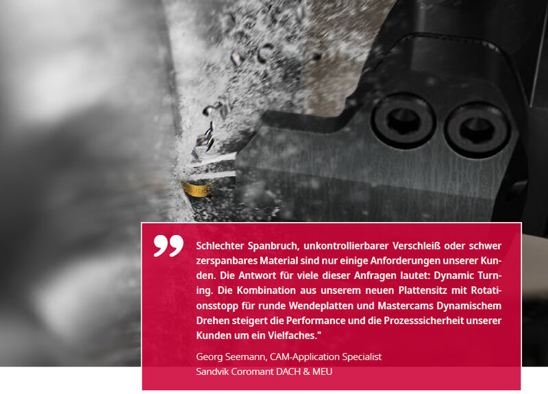 „Schlechter Spanbruch, unkontrollierbarer Verschleiß oder schwer zerspanbares Material sind nur einige Anforderungen unserer Kunden. Die Antwort für viele dieser Anfragen lautet: Dynamic Turning. Die Kombination aus unserem neuen Plattensitz mit Rotationsstopp für runde Wendeplatten und Mastercams Dynamischem Drehen steigert die Performance und die Prozesssicherheit unserer Kunden um ein Vielfaches.” Georg Seemann, CAM-Application Specialist Sandvik Coromant DACH & MEU